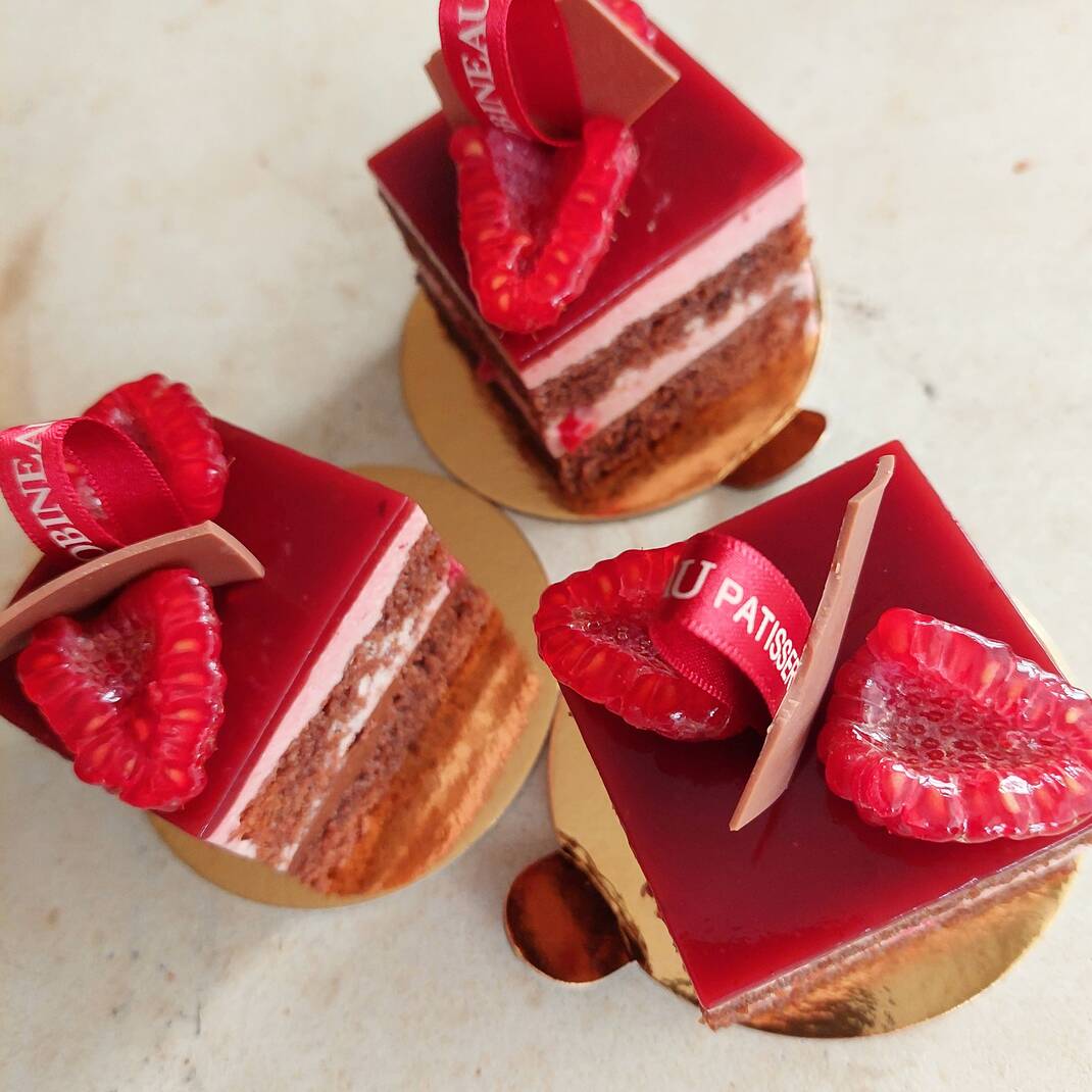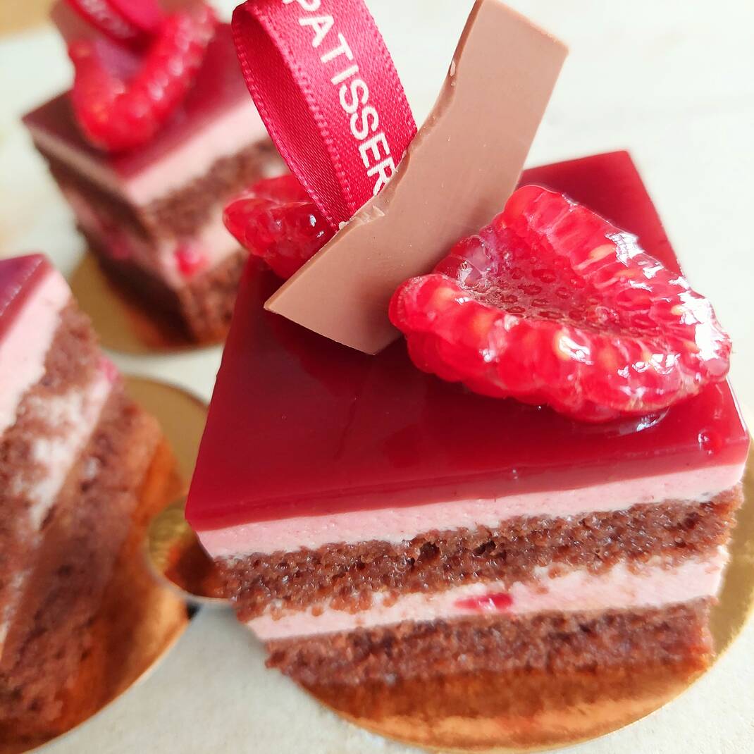 Two Chocolate & Raspberry Delices made with layers of chocolate sponge, chocolate ganache and raspberry mousse topped with raspberry jelly and fresh raspberries