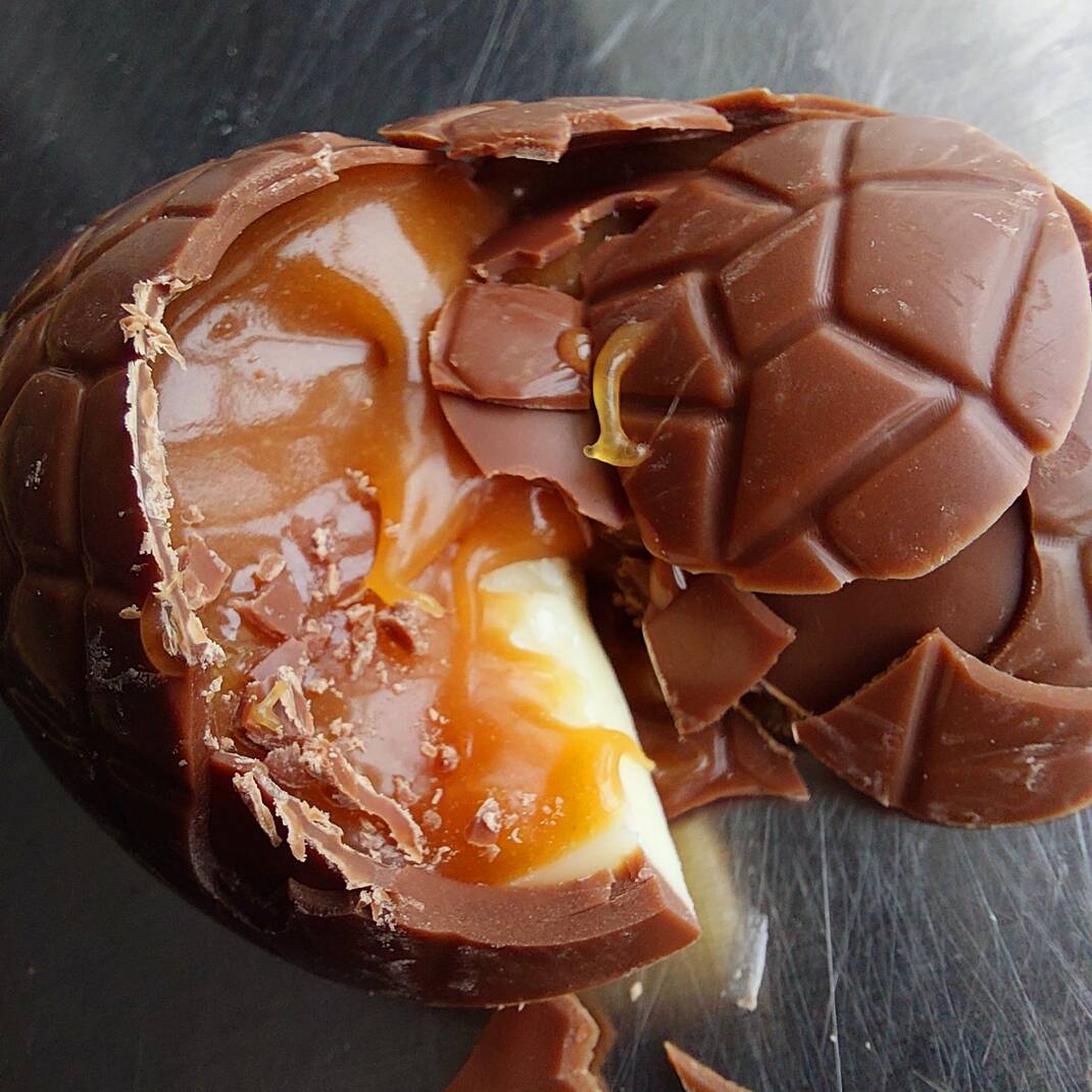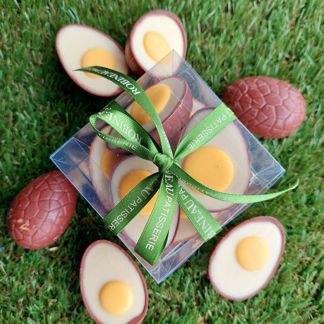 A box of six beautifully hand crafted eggs, made from superior milk chocolate, filled with our deliciously gooey homemade sea salted caramel and hand decorated with a white chocolate 'fried egg'.