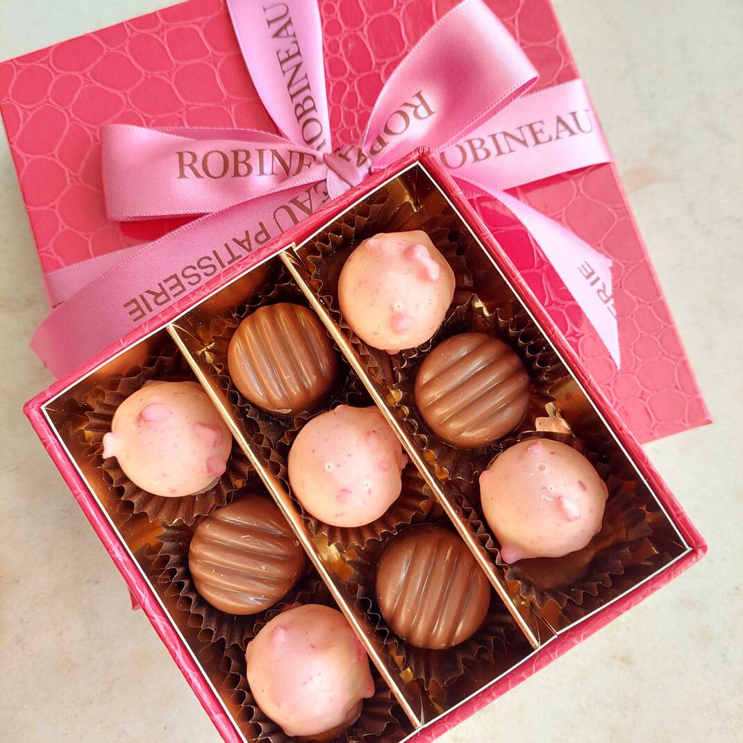 A box of nine Milk Chocolate Pecan Pralines and Pink Raspberry Truffles