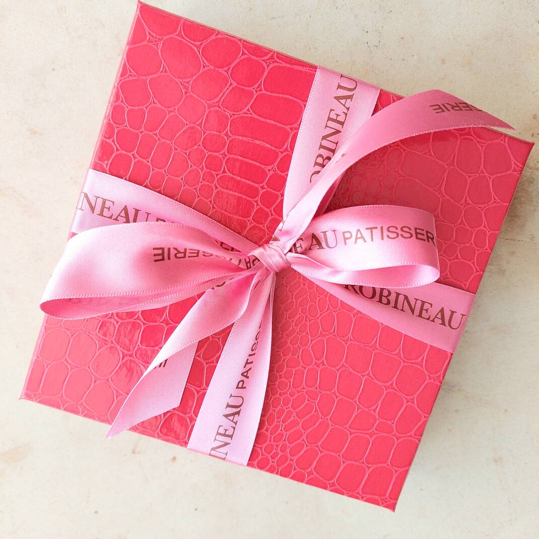 A duo of handmade Milk Chocolate Pecan Pralines, crispy milk chocolate shells filled with smooth praline with caramelized pecan nut pieces and Pink Raspberry Truffles, white chocolate and raspberry ganache coated with raspberry chocolate and raspberry pieces presented in a pink mock-croc gift box and finished with our branded ribbon