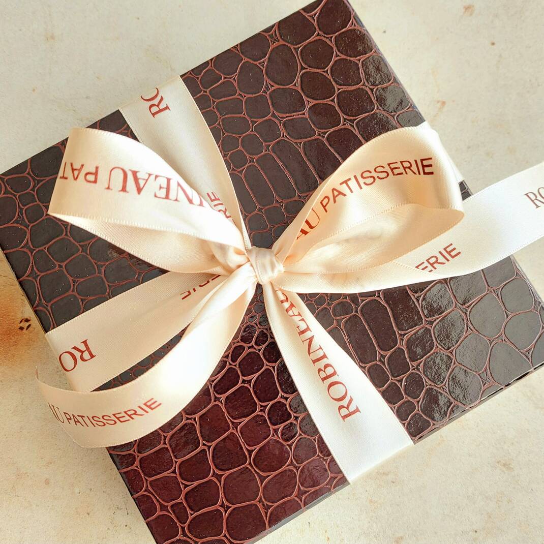 A box of nine handmade Sea Salted Caramels made with 64% dark chocolate, homemade soft caramel and Maldon Sea salt flakes, presented in a brown mock-croc gift box and finished with our Robineau branded ribbon