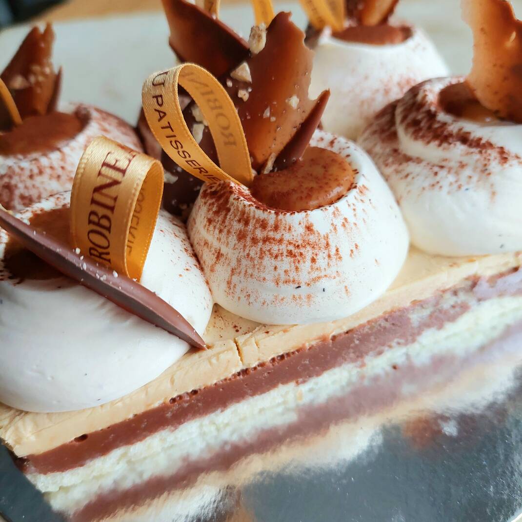 Almond macaroon sponge topped with a chocolate ganache, toffee mousse, Vanilla Chantilly cream and soft Caramel. Rated 'excellent' by our pre-launch customer survey.