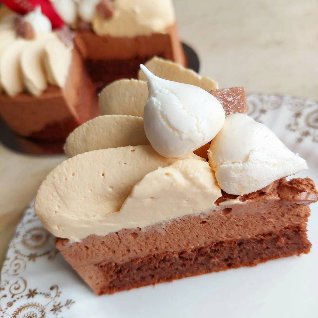 Layers of chocolate and almond sponge, dark chocolate parfait (soft ice cream) topped with a layer of caramel Chantilly.
