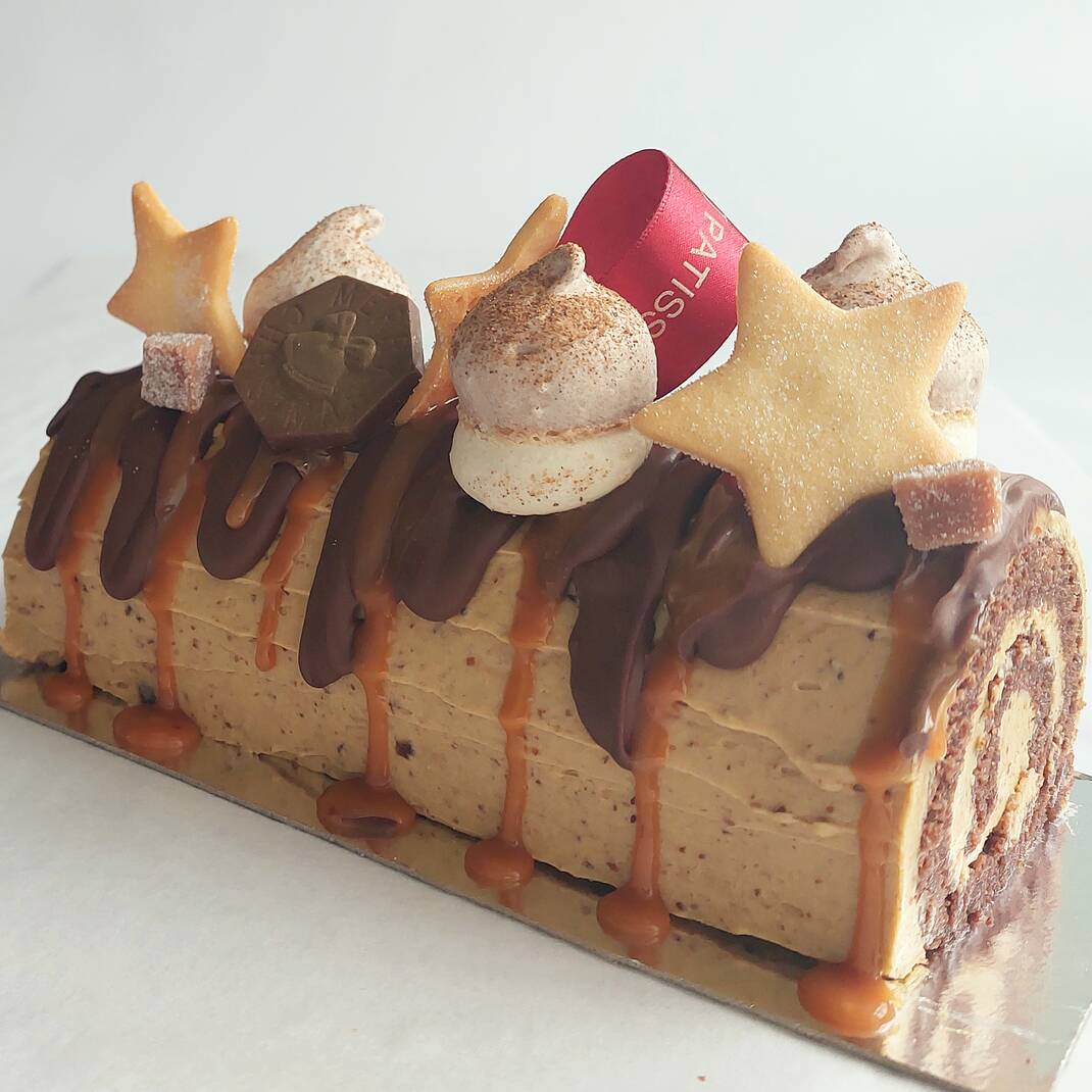 All the flavours of Sticky Toffee with chocolate sponge rolled in a log, topped with toffee and Christmas decorations