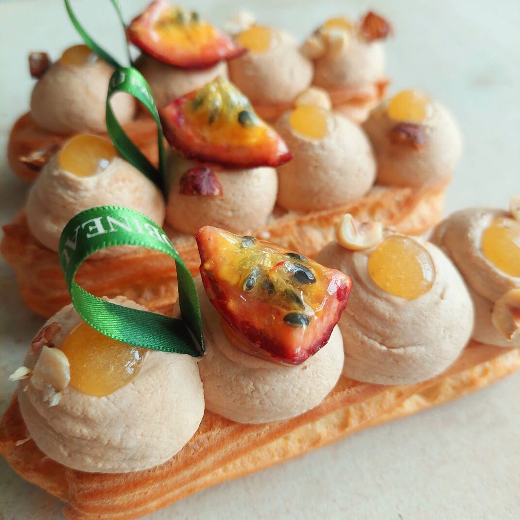 Handmade choux éclair filled with hazelnut cream, made with Acorn Dairy’s double cream, and passion fruit gel with toasted hazelnuts