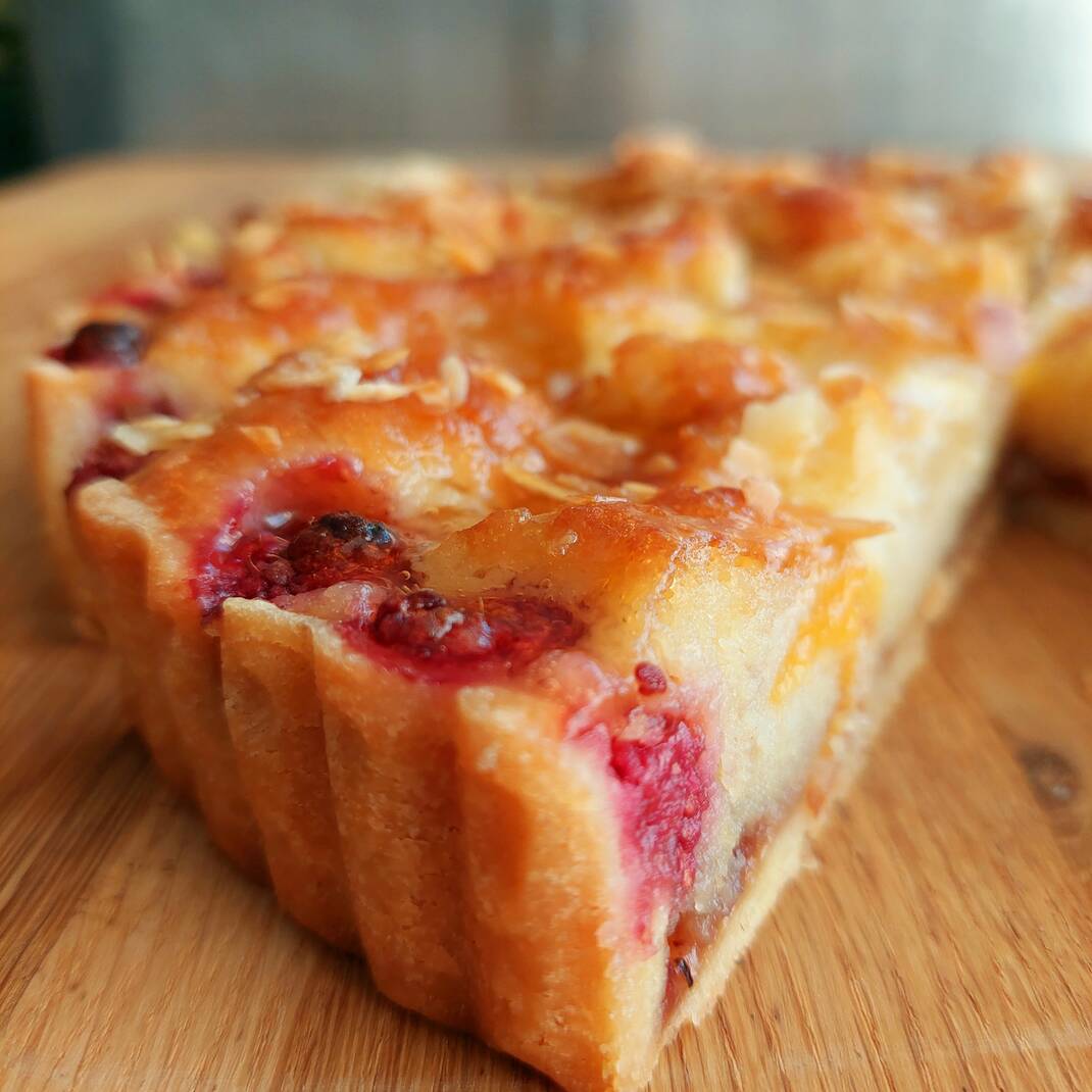 A slice of our ever popular frangipane. Sweet all butter pastry case topped with a layer of raspberry jam, filled with our homemade almond filling and finished with seasonal mixed fruit.