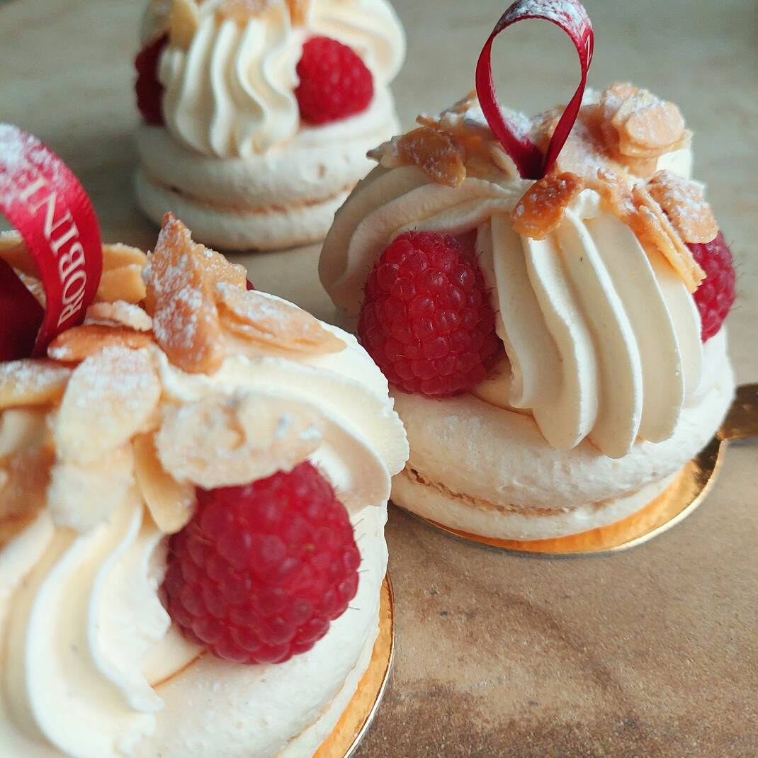 A chewy almond meringue nest with Raspberry Gel, Vanilla Chantilly Cream, Fresh Raspberries and topped with Toasted Almonds
