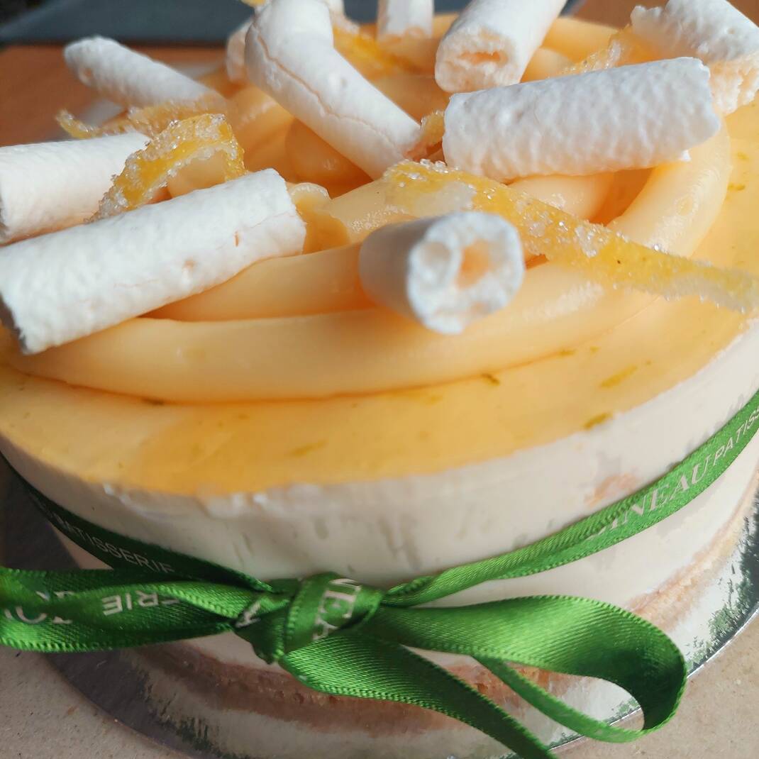 A buttery biscuit base, Lemon and Lime cheesecake topped with lemon curd and meringue pieces