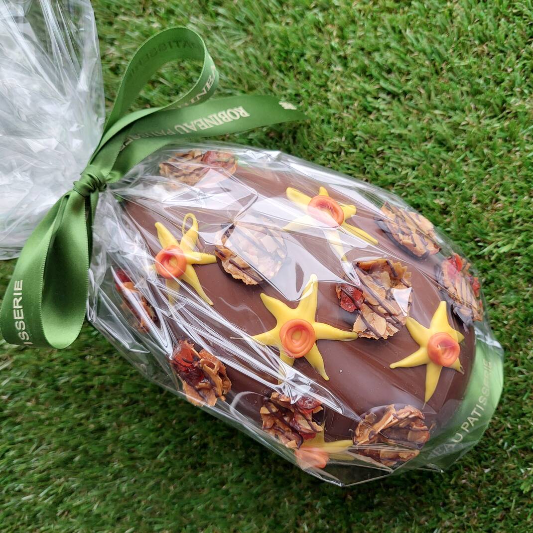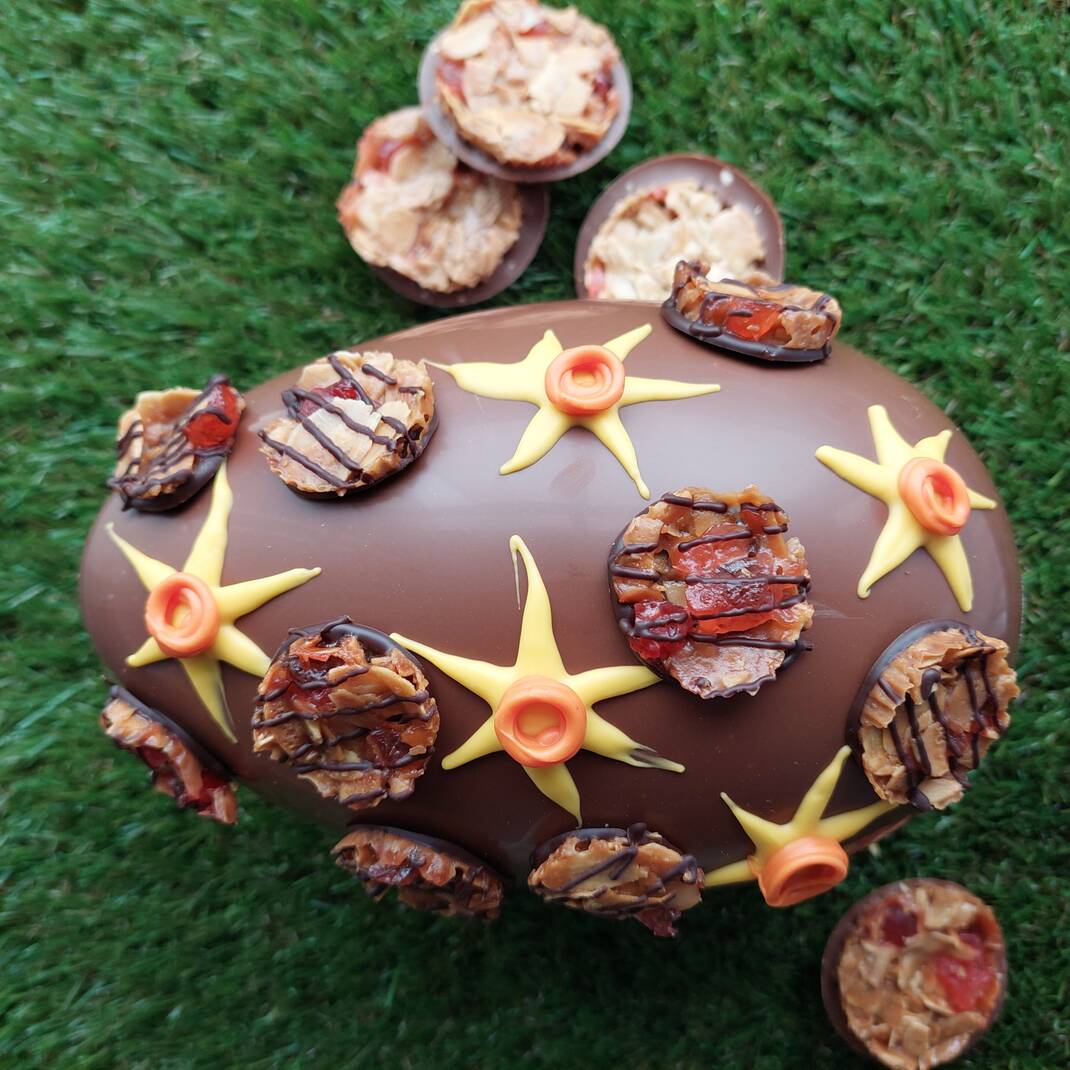 A chocolate shell made with two layers of smooth rich milk 35% chocolate, decorated with homemade Florentines coated in milk chocolate.