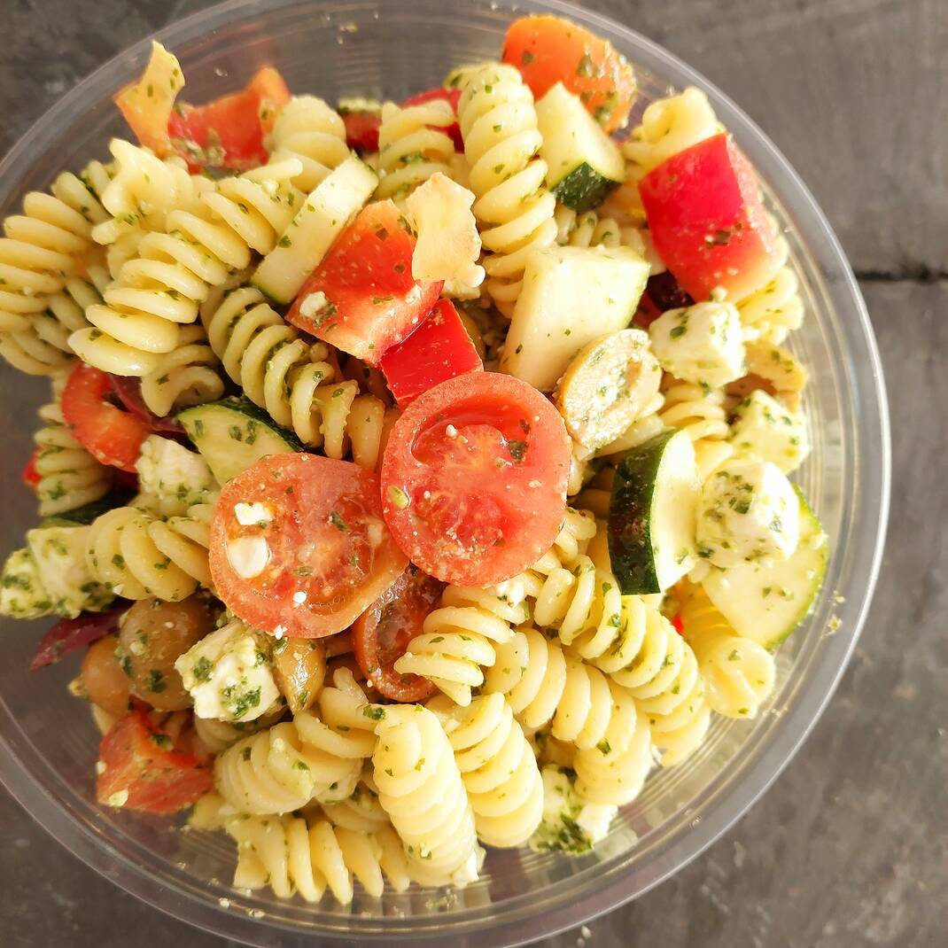 Fresh fusilli pasta with roasted peppers, aubergine, courgette, olives, cherry tomatoes and feta cheese with a basil pesto dressing.