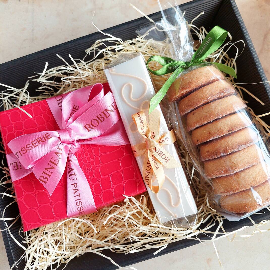A black fluted tray with cream shred fill, wrapped in cellophane with a Robineau branded ribbon:
