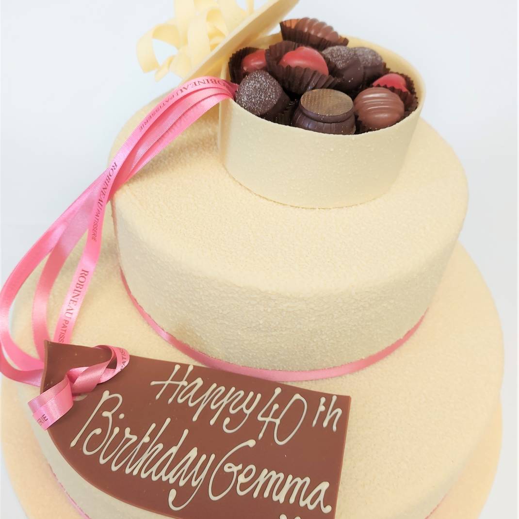 Our Chocolate Box design is made with layers of chocolate sponge and chocolate ganache. The gateau is then covered with a thin layer of marzipan and finished with a white chocolate spray effect. A handmade chocolate box with a dozen handmade chocolates decorates the top of the cake. The lid of the box can be finished with either a chocolate rose or curl. An inscription of your choice is hand piped on a chocolate tag.